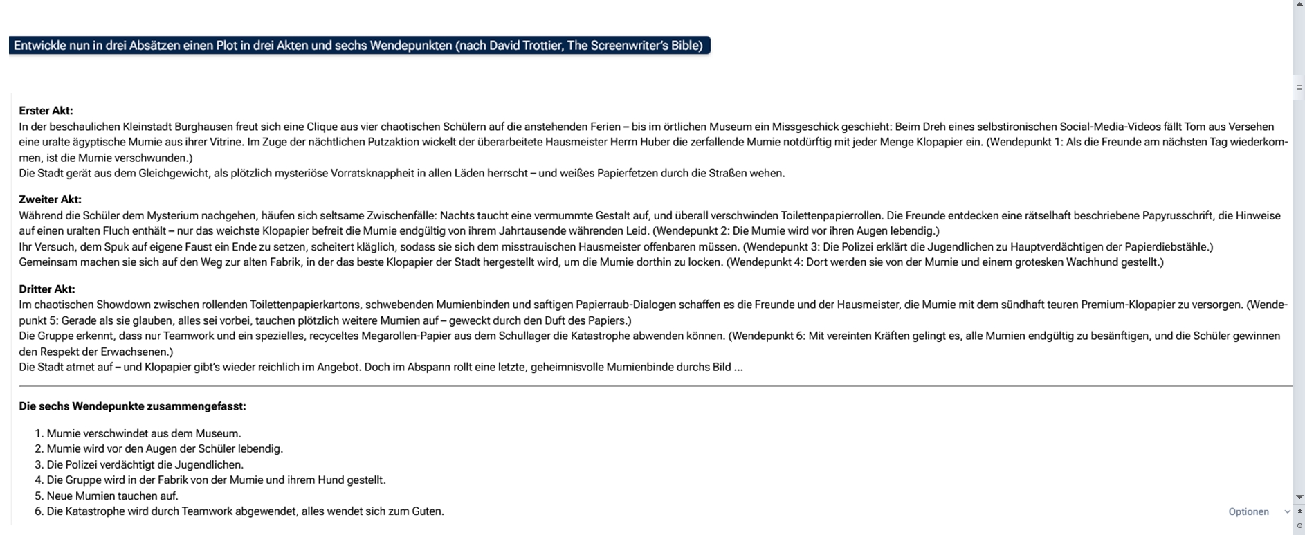 > Für das Drehbuch im Standardformat (ca. 20 Seiten) mussten wir mehrfach Nachfragen stellen („bitte weiter ausgeben“), um zumindest den ersten Akt vollständig zu erhalten (ca. vier DIN‑A4‑Seiten- hier ein Ausschnitt).