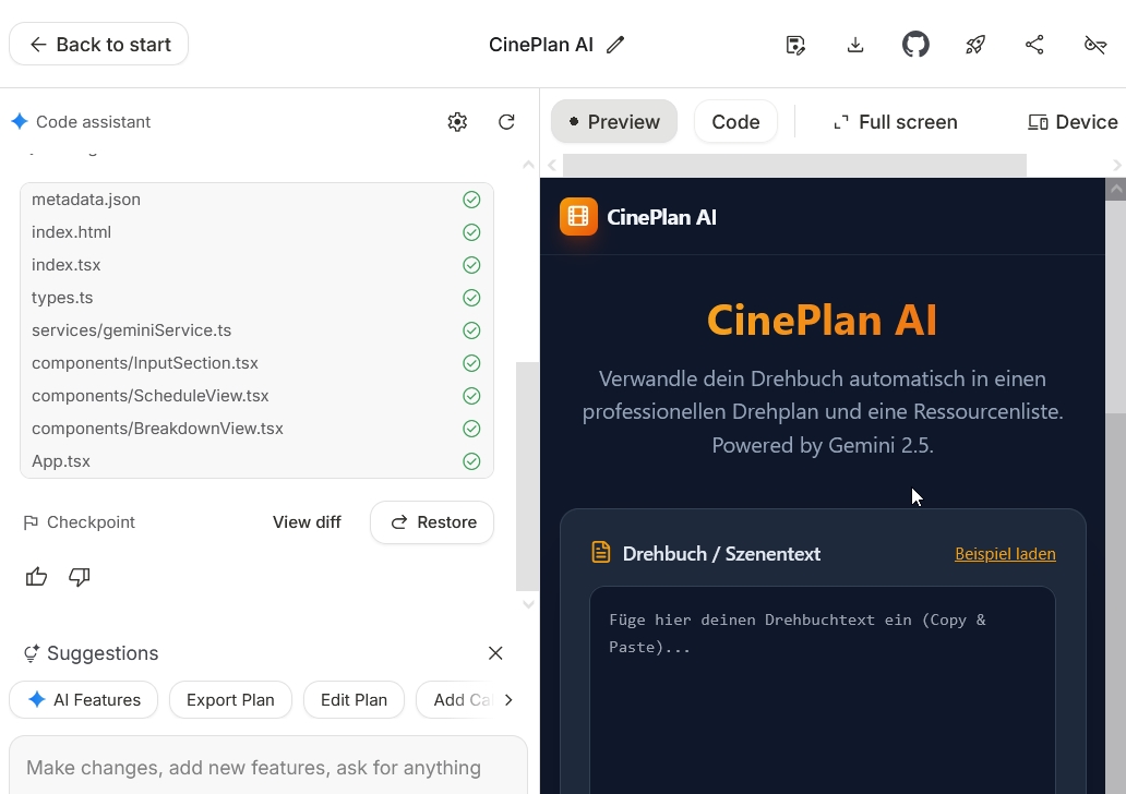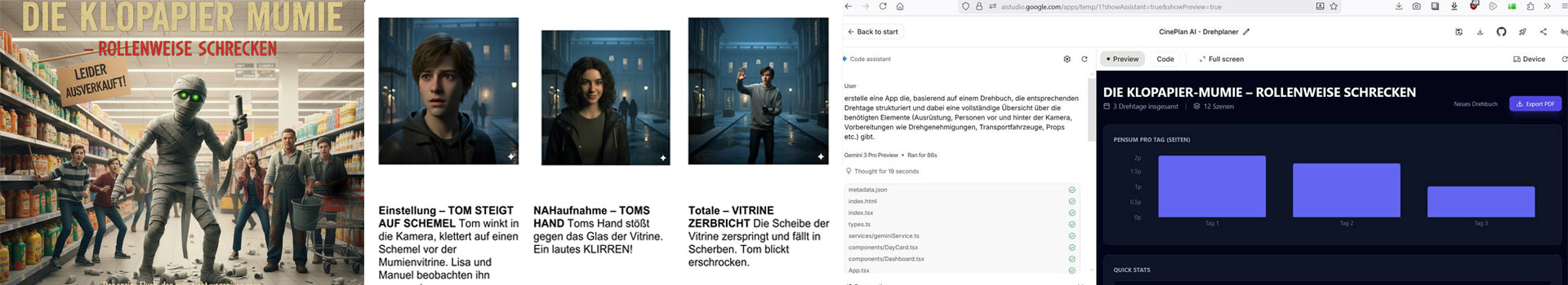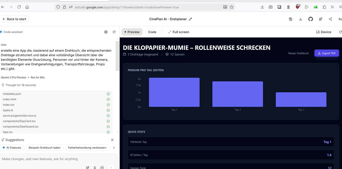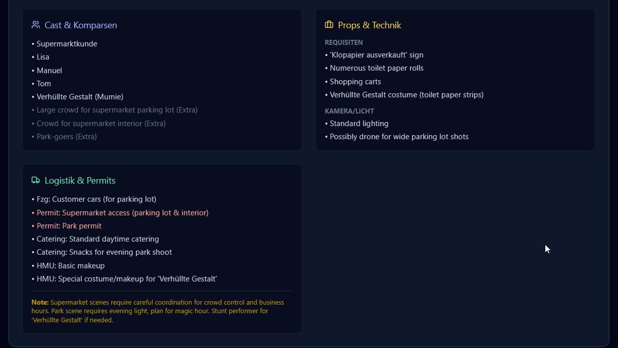 Dadurch ließ sich aus dem ersten Akt eine praktikable Drehtag‑Planung- hier Cineplan AI genannt – (Beispiel 1 und Beispiel 2) für drei Tage generieren.