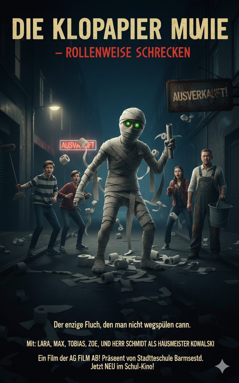 Als in einer beschaulichen Kleinstadt plötzlich eine uralte Mumie erwacht – notdürftig mit Toilettenpapier umwickelt und auf der Suche nach dem weichsten Klopapier der Stadt – müssen eine chaotische Schüler-Clique und ihr überforderter Hausmeister den Fluch der „Klopapier-Mumie“ stoppen, bevor es keine einzige Rolle mehr im Ort gibt… und das Chaos seinen Lauf nimmt!